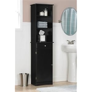 The sturdy espresso bathroom storage cabinet from Ameriwood is perfect for additional storage, while minimizing floor space in the bathroom. Plenty of open and closed shelf space with adjustable shelving ensures the storage of your bathroom items. Product Features: Espresso finish 3 Shelves( 2 adjustable) offer ample open storage 1 drawer and 1 door provide ample concealed storage 2 shelves (1 adjustable) behind door Ea... Read More...